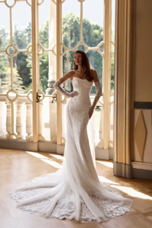 In produzione sono effettuate una serie di lavorazioni tipiche dell’alta moda: il moulage, che è il drappeggio dei tessuti effettuato direttamente sul manichino per garantire qualità e vestibilità ottimali, e l’intaglio, che è la lavorazione dei pizzi e prevede il taglio manuale e la modellatura a manichino per ottenere un effetto di ricamo esclusivo. Le finiture degli abiti sono effettuate a mano tramite cuciture invisibili sul capo finito per adattarsi a tutte le richieste della sposa e rendere quel giorno speciale ed unico, proprio come unica è la donna che lo indosserà.
